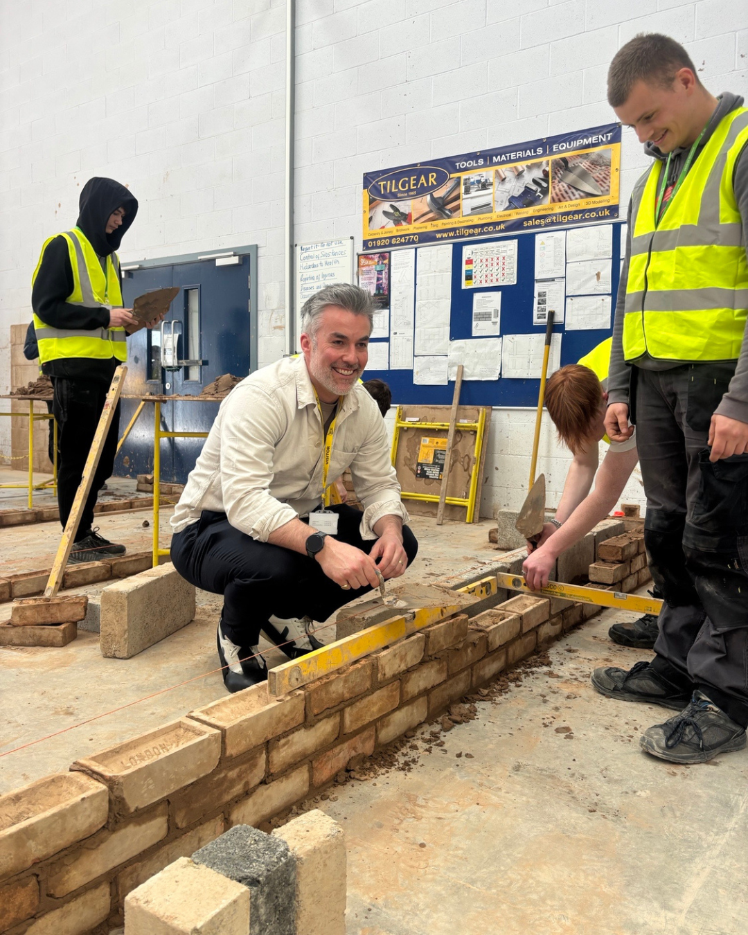 The visit continued in the bricklaying workshop, where the mayor spoke with adult learner Noah about his experience at the college. He also had the opportunity to try bricklaying himself, gaining a hands-on understanding of the skills being taught.